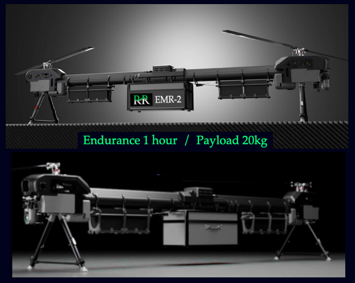 The EMR-2 is a unique electrical powered tandem rotor system providing unparalleled performance for unmanned cargo transport and delivery for Industrial and Defence related entities. Following in the footsteps of the CH-47 Chinook helicopter the tandem rotor has many of the same compelling advantages …. Outstanding stability , Impressive lifting power , Versatile cargo handling , High Altitude performance, Variable pitch technology.