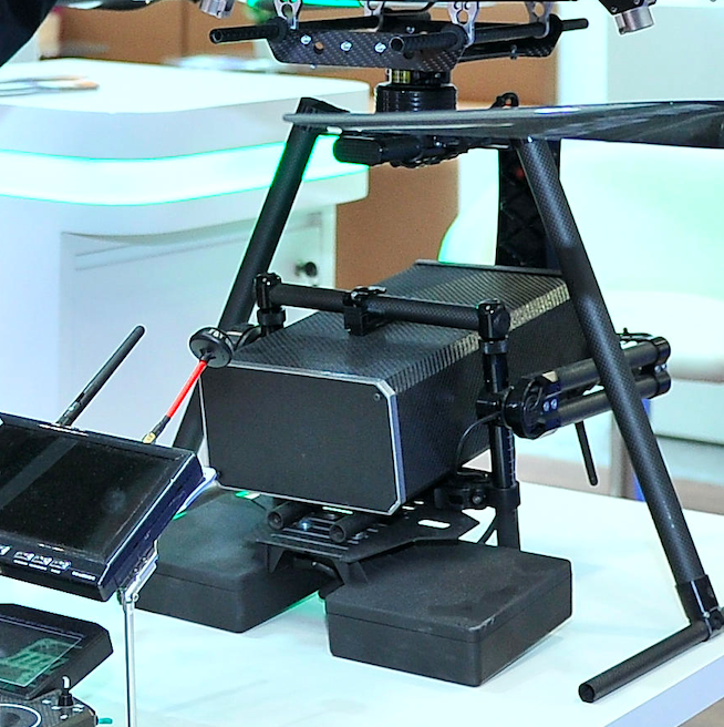 Gremsy Gimbal with a choice of 1W or 5W Laser Dazzler (532nm green-2km range) supported by a Laser Rangefinder, a Laser Designator and EO/IR camera’s for flight and targeting. While the 1W is mainly for dazzling the 5W could be highly effective to counter FPV drones by targeting the CMOS sensors and wash-out or burn the sensors and electronics .
